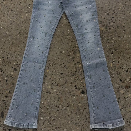 "Prosperity" features blue wash flared jeans, embellished with an intricate crystal pattern and high-end detailing. A true statement piece that exudes bold style.