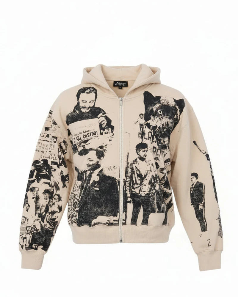 The Revolt Zip Hoodie by Concept LA is a bold statement piece that blends streetwear energy with raw, expressive design. This full zip hoodie features an all over graphic collage that pulls from protest imagery, vintage photo prints, and gritty textures, giving it a worn in, rebellious feel that stands out without trying too hard. The neutral beige base keeps it easy to style, while the high contrast black graphics add depth and attitude from every angle. Designed with a comfortable relaxed fit, this zip up hoodie is perfect for everyday wear, whether you’re layering it over a tee or wearing it as the main piece. The full zip front, ribbed cuffs, and hooded construction bring classic streetwear functionality, while the detailed artwork sets it apart from standard hoodies. Ideal for fans of graphic hoodies, statement zip hoodies, and contemporary street fashion, the Revolt Zip Hoodie fits right into modern urban style and pairs effortlessly with denim, cargos, or stacked jeans.