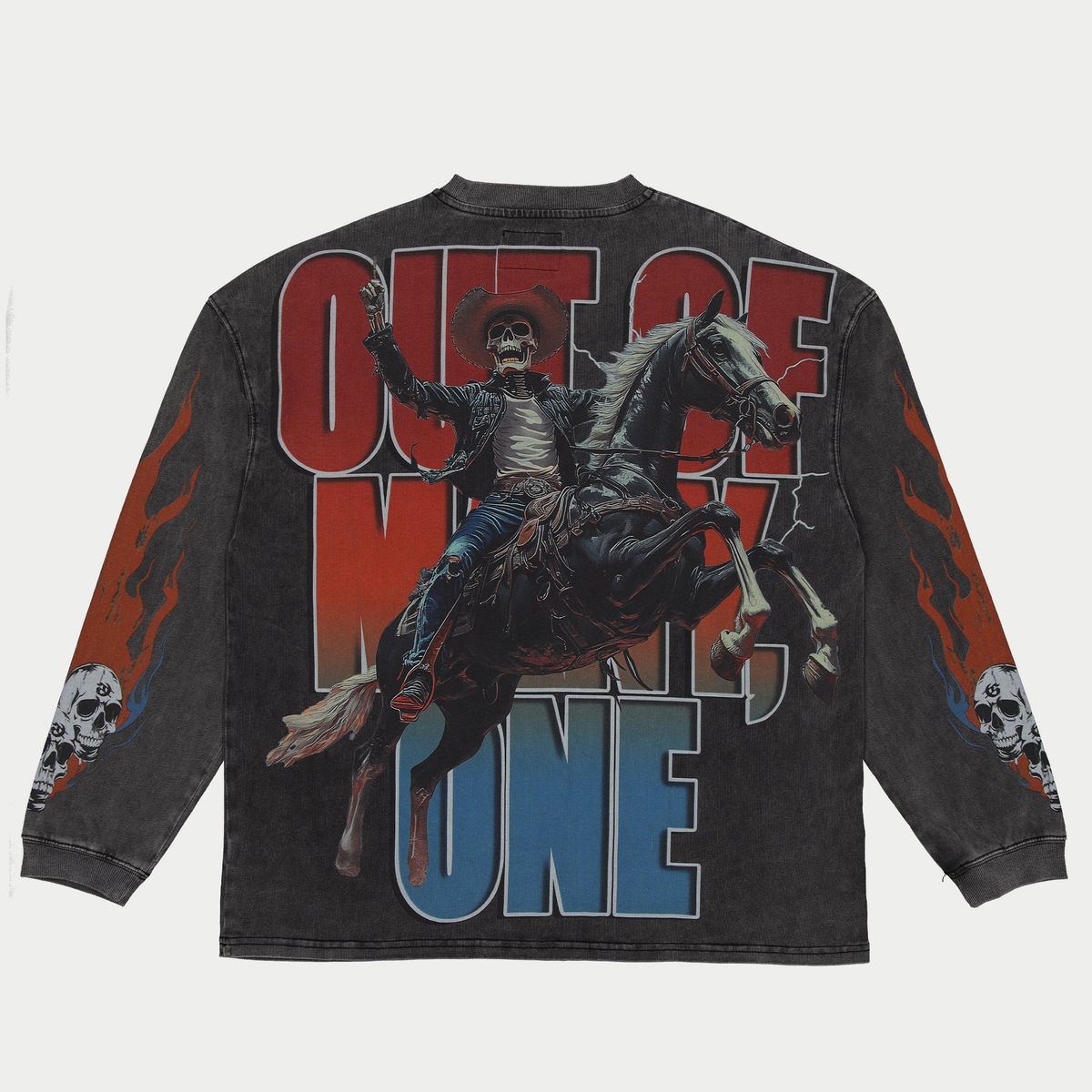 This long sleeve is crafted from 10oz mid-weight washed fabric and features a striking digital art piece.